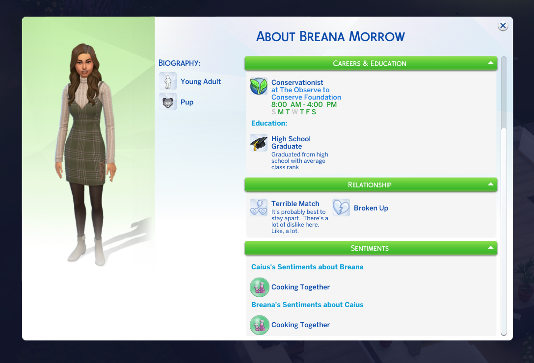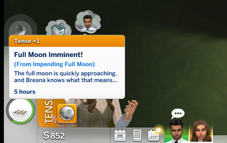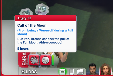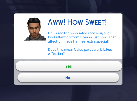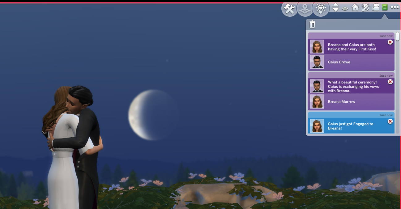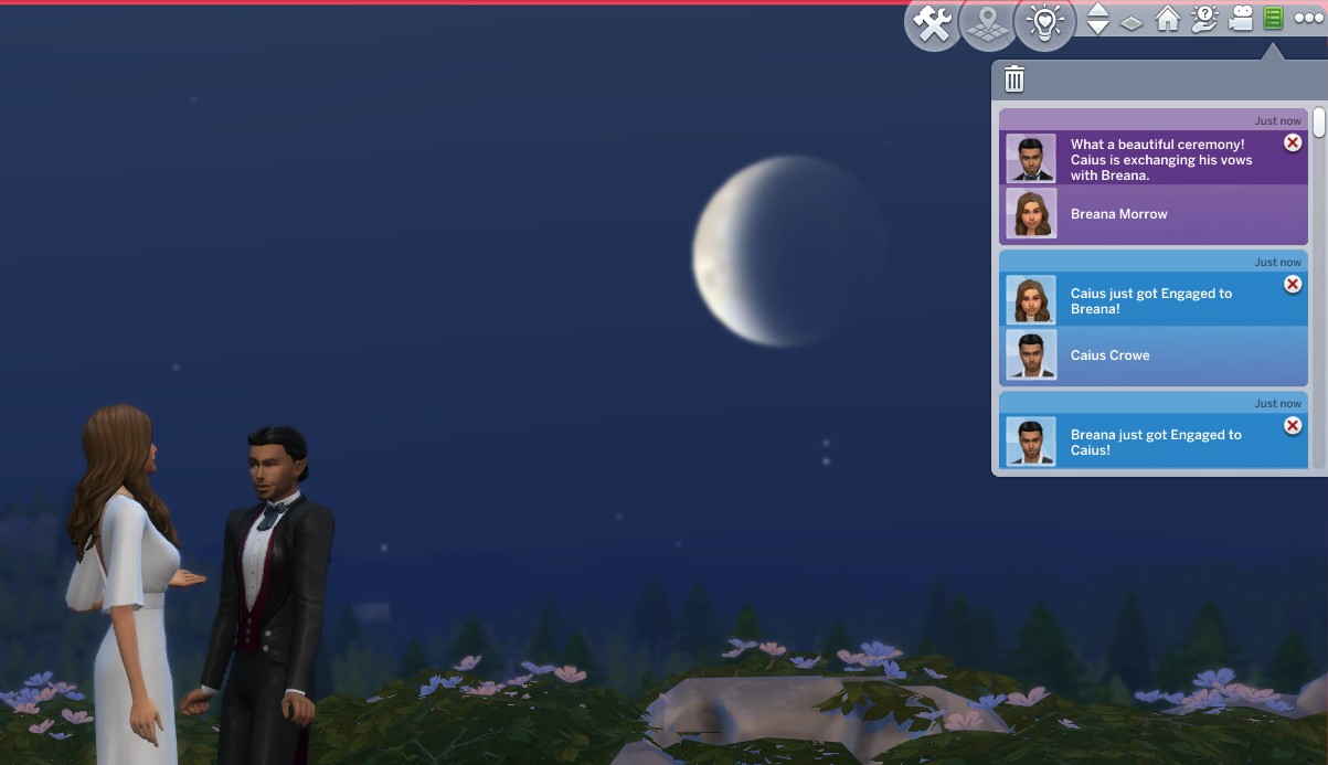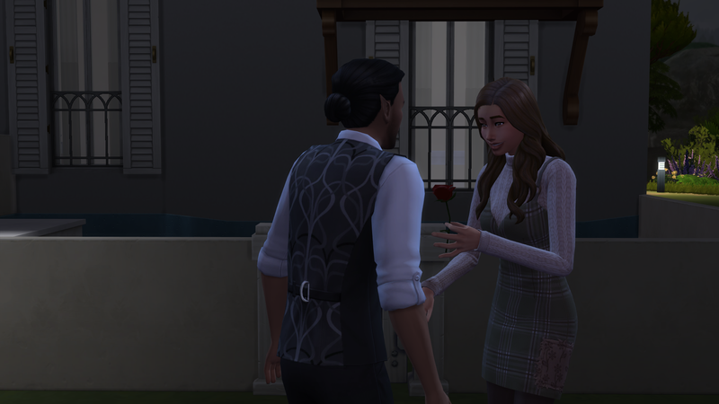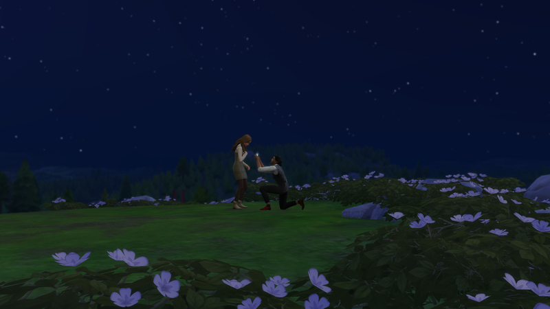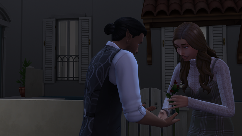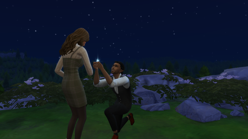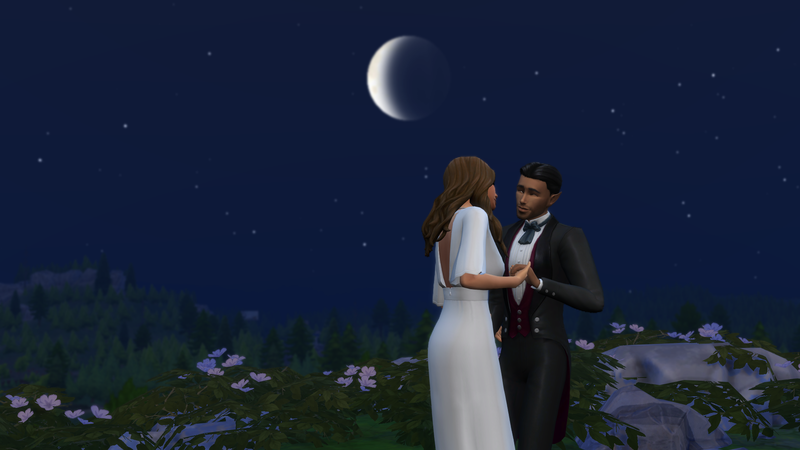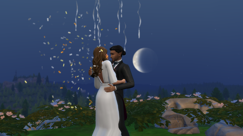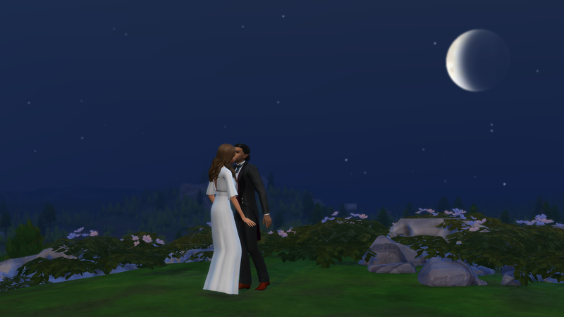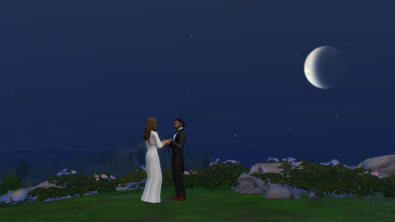 Successful, and the added difficulty was definitely felt. It took me 16 days of struggling through various occult challenges and the current Sims 4 bug where Sims who are given autonomy will opt for largely insulting conversation topics. That being said, it was an interesting experiencing getting the two back together. Caius learned to cook even though he doesn’t eat food to feed Breanna, and Breanna autonomously developed a werewolf trait (Night Wolf) to make her life schedule more in line with that of a vampire. They were both menaces to society with Caius drinking the blood of neighborhood sims, and Breanna scaring the breaks off of the people at the wedding venue while rampaging. They even became so close that Breanna let Caius drink some of her blood when he had really low needs, though it apparently tasted pretty bad. I took them to the mountain on Moonwood Mill and Caius proposed to Breanna at midnight. I completed the Soulmate requirement here. They eloped immediately, and that was all she wrote. Overall, very sweet 🙂