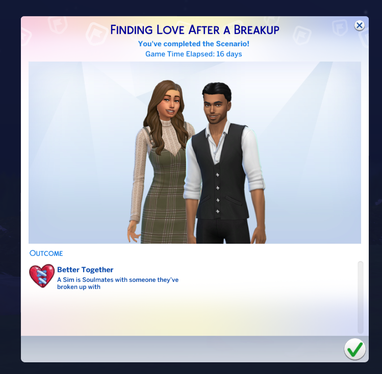 - Achieve outcome 1, “A Sim is Soulmates with someone they’ve broken up with”